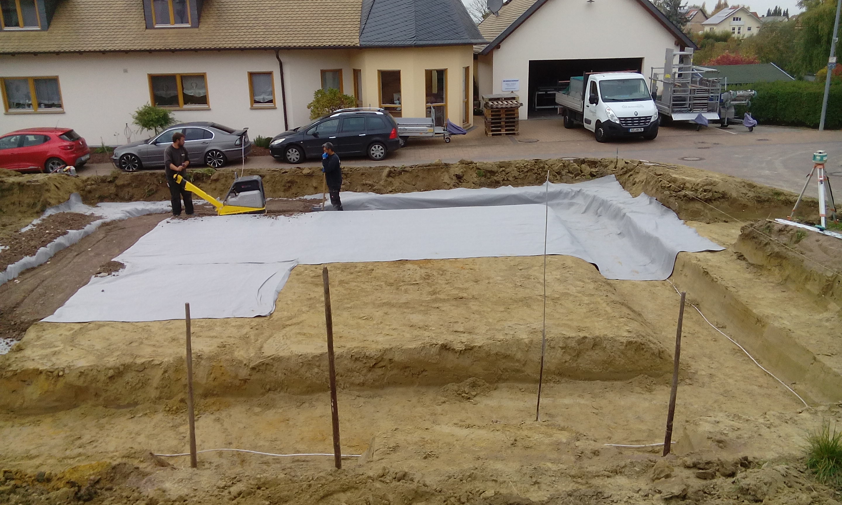 10.11.2017 – Wir führten auf dieser Baustelle die Erdarbeiten, die Kanalarbeiten, das Versetzen des Revisionsschachtes, der Zisterne und die Erstellung der Garagen-Fundamente aus.